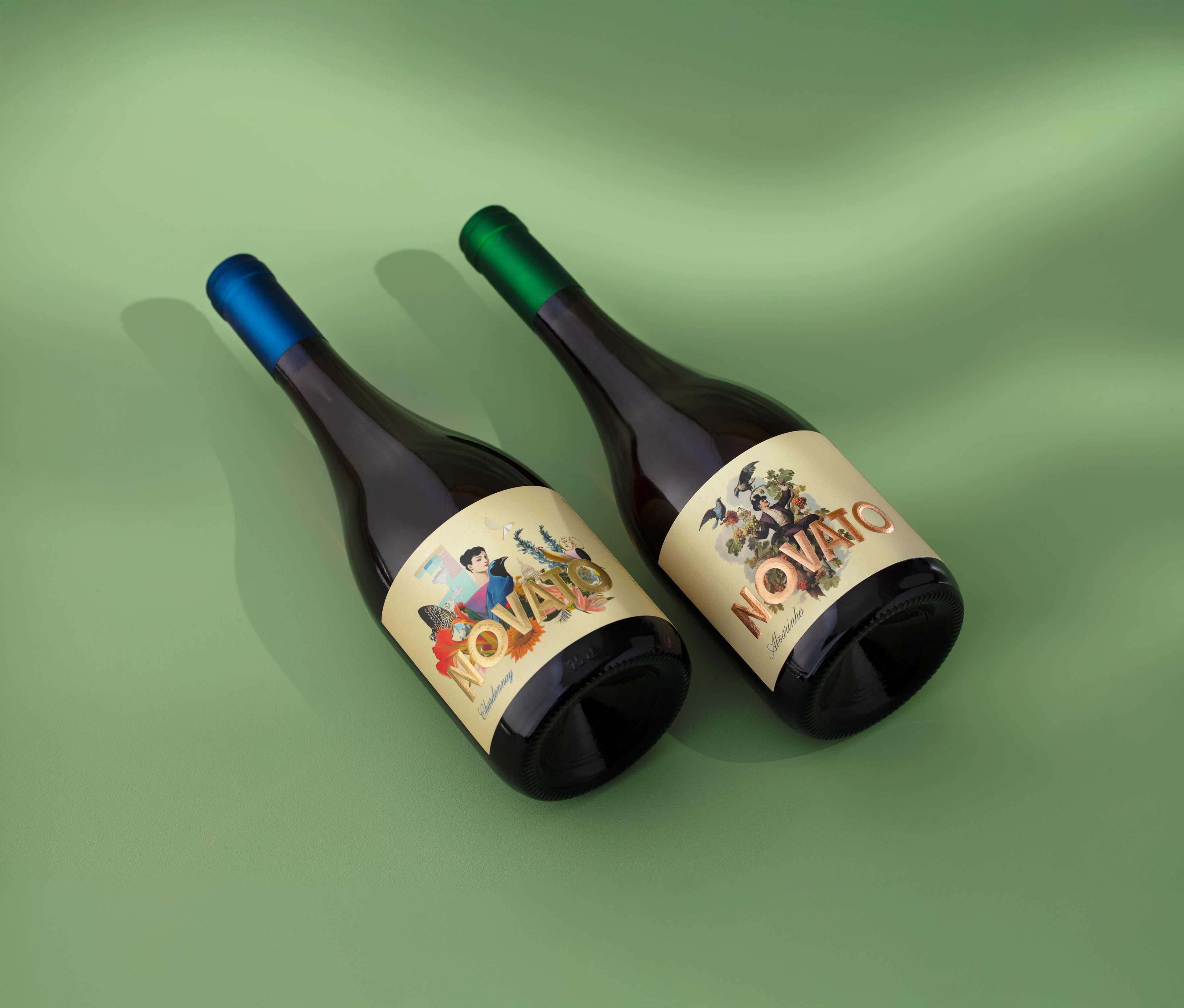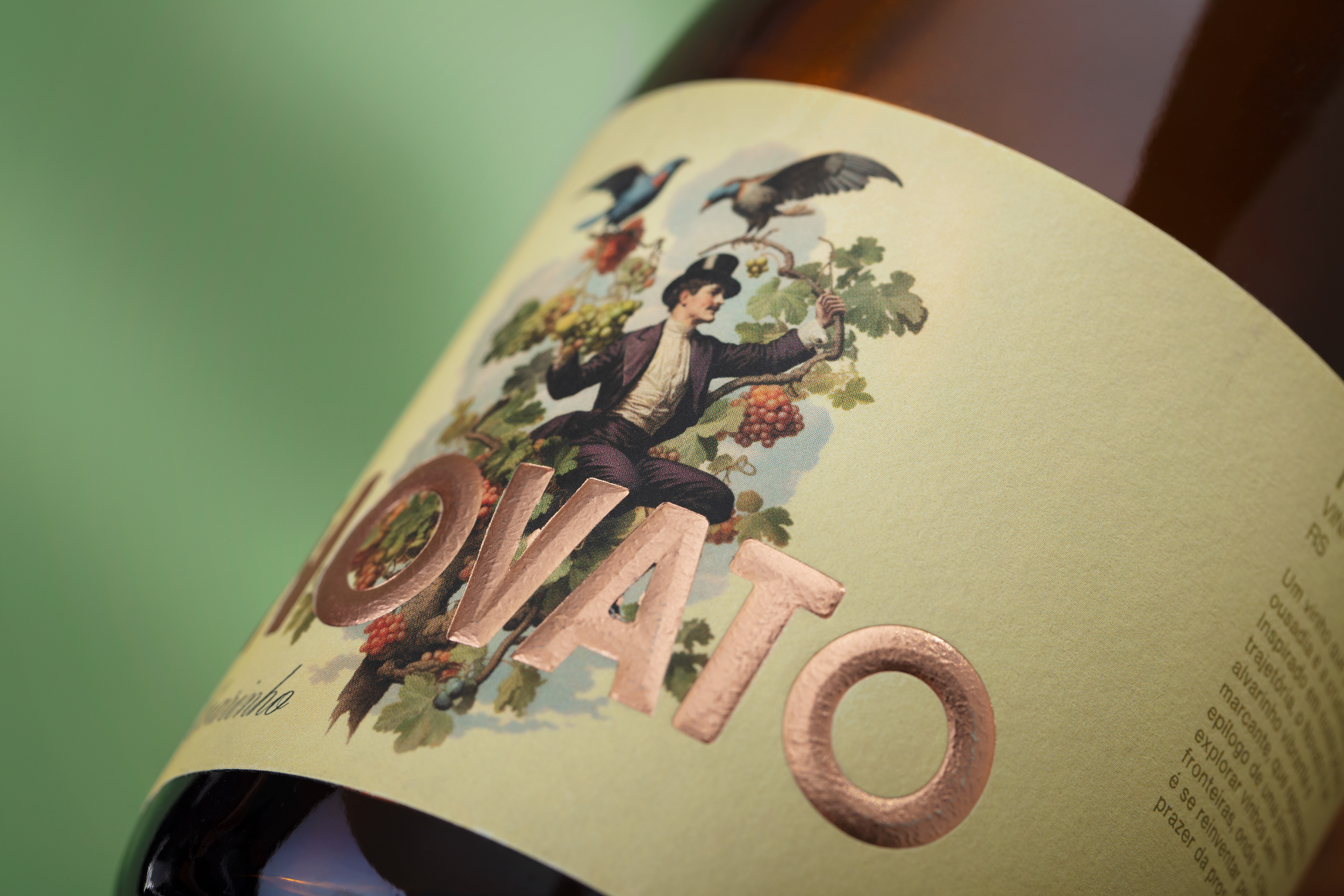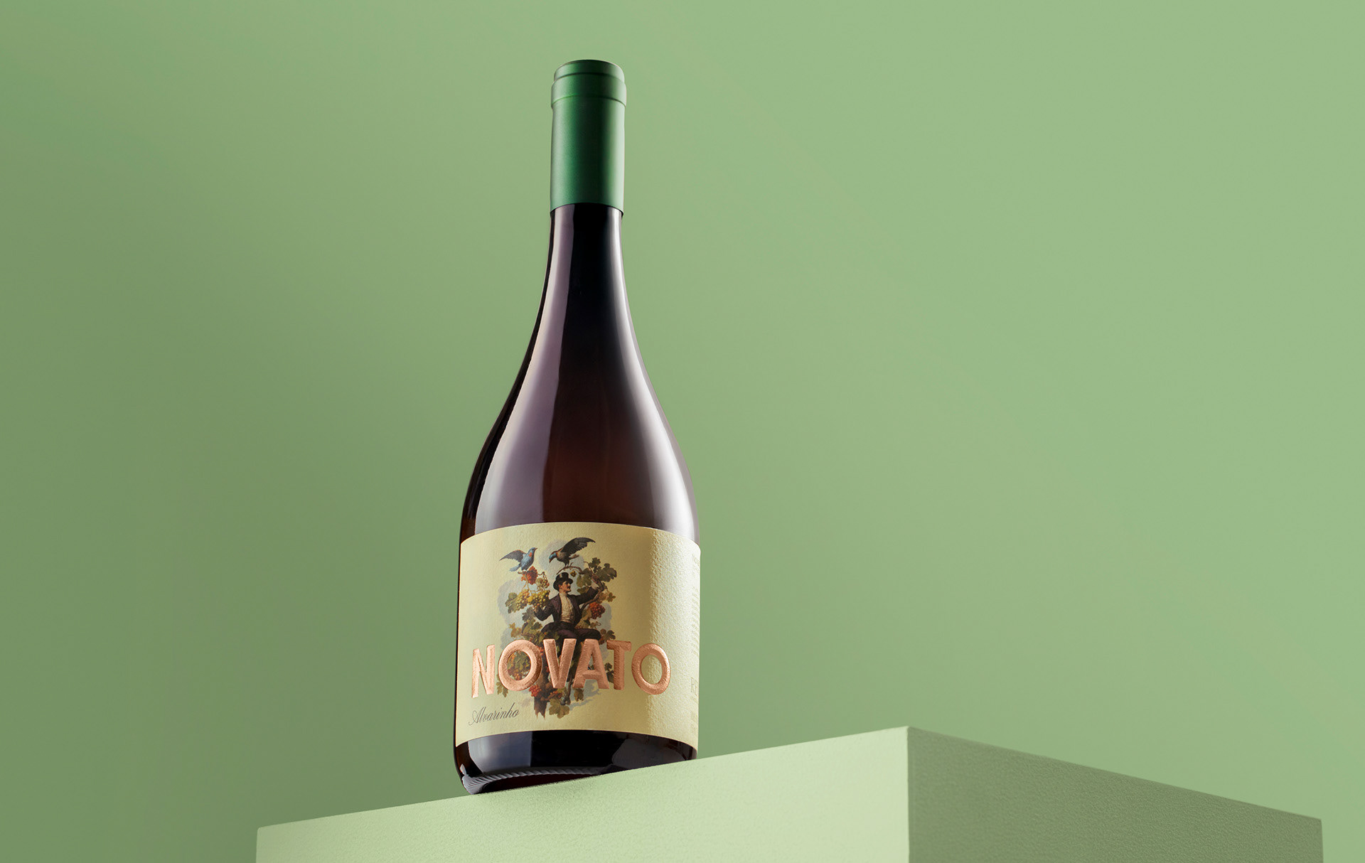 Novato means “beginner” in Portuguese and is inspired by the founders’ own story. Not coming from a long established wine background, they embrace this condition with curiosity, irreverence, and a subtle sense of irony. Novato is an Alvarinho that celebrates creative freedom and the absence of rules that often come with starting something new, translating the spirit of the novice as intuitive, fearless, and open to experimentation. The illustration evokes a sense of wonder, almost magical, portraying a character rooted in classic wine culture and Old World references, yet reinterpreted through a contemporary and irreverent lens. Floral notes, lightness, and subtle urban moments unfold a fresh and vibrant character where tradition is gently disrupted by modernity and reinvention happens naturally through conversation, laughter, and shared experiences.