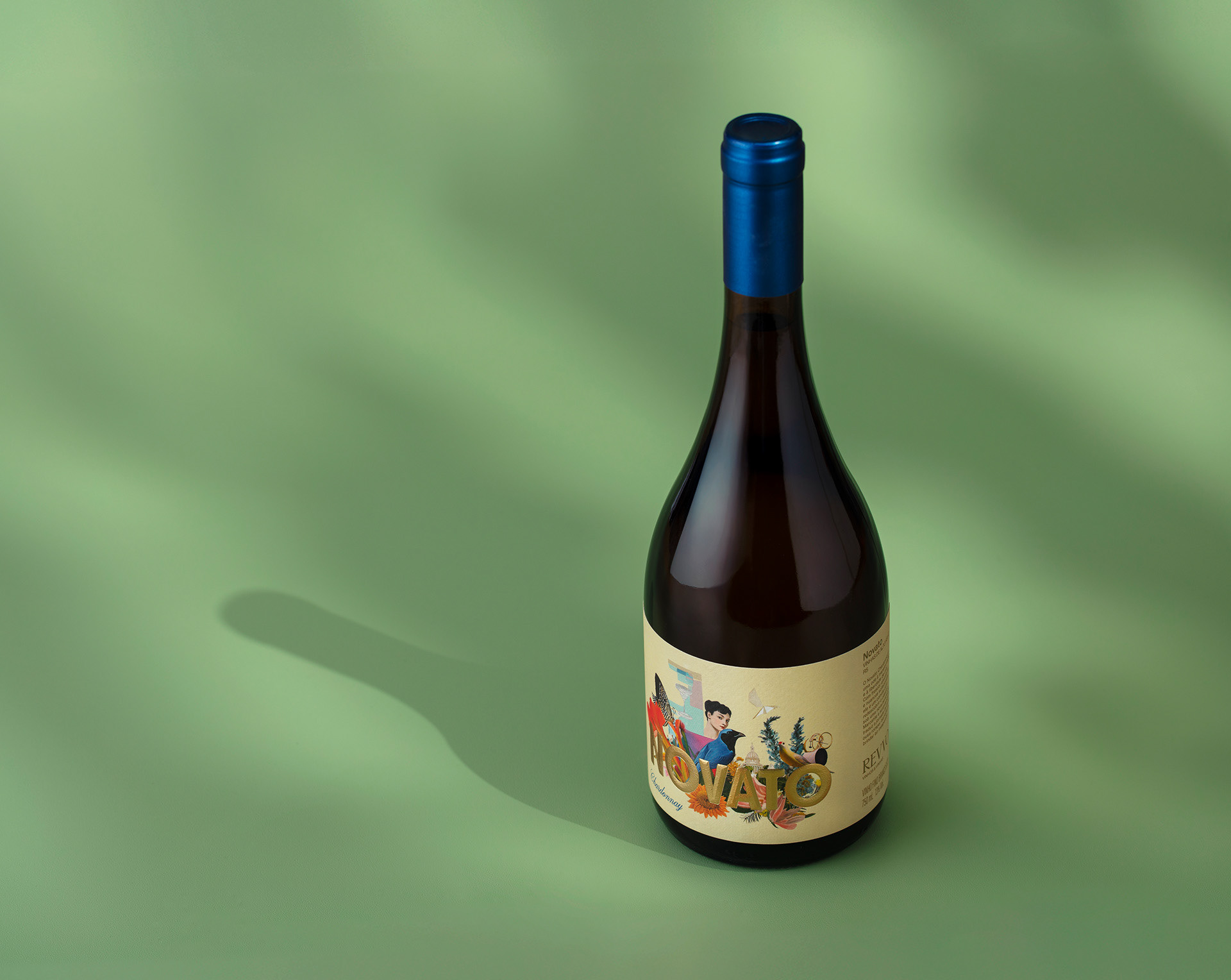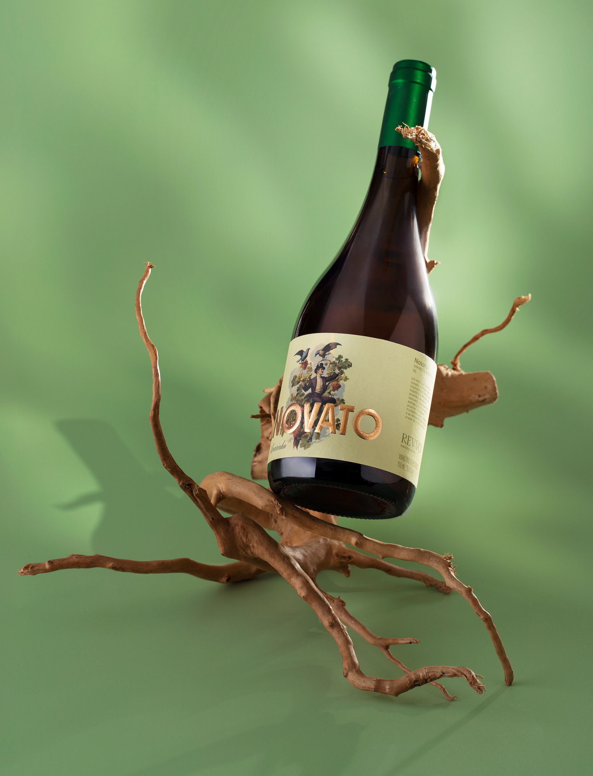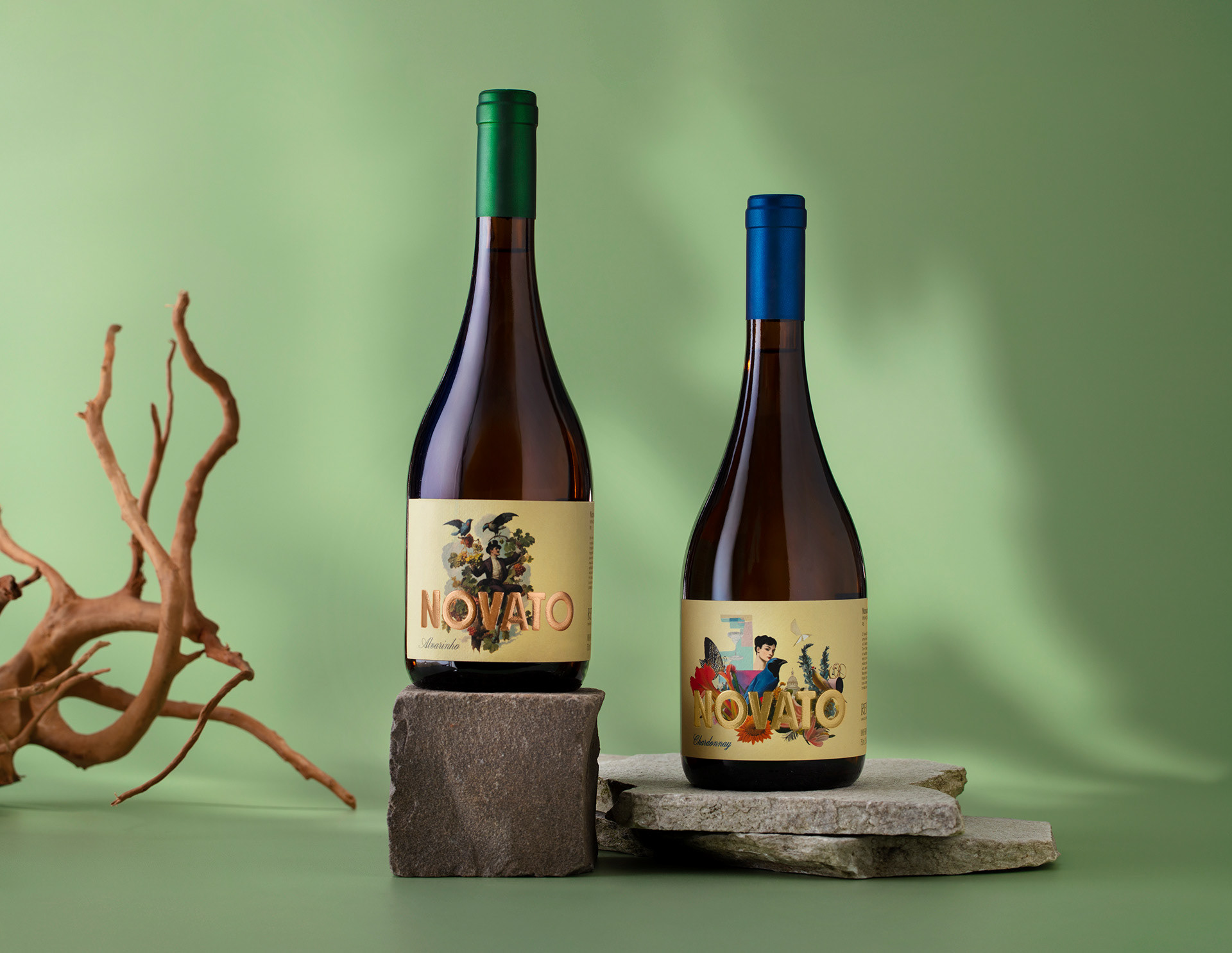 Novato means “beginner” in Portuguese and is inspired by the founders’ own story. Not coming from a long established wine background, they embrace this condition with curiosity, irreverence, and a subtle sense of irony. Novato is an Alvarinho that celebrates creative freedom and the absence of rules that often come with starting something new, translating the spirit of the novice as intuitive, fearless, and open to experimentation. The illustration evokes a sense of wonder, almost magical, portraying a character rooted in classic wine culture and Old World references, yet reinterpreted through a contemporary and irreverent lens. Floral notes, lightness, and subtle urban moments unfold a fresh and vibrant character where tradition is gently disrupted by modernity and reinvention happens naturally through conversation, laughter, and shared experiences.